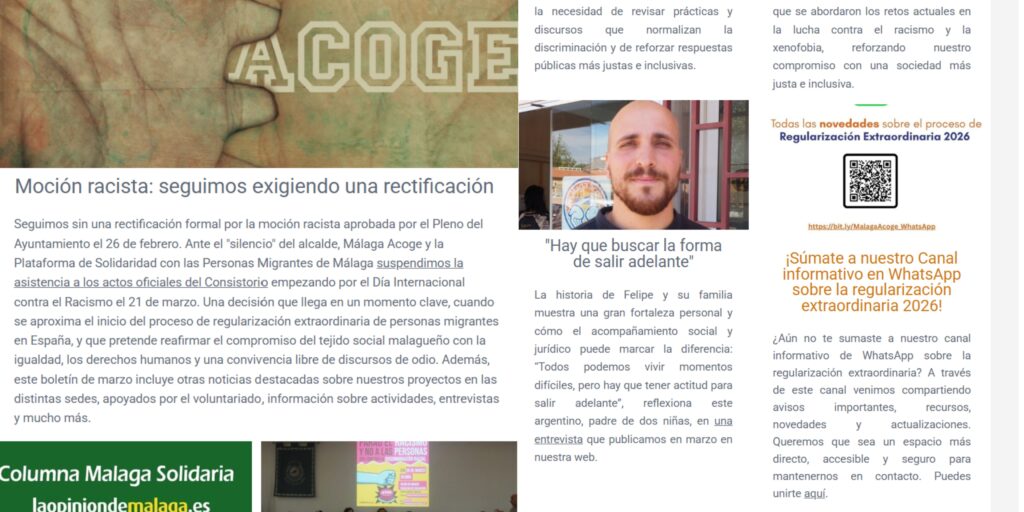 Marzo en Málaga Acoge: defensa de los derechos y trabajo en redNuestro boletín de noticias de marzo refleja la realidad de la asociación, que sigue trabajando con firmeza por los dereLeer la noticia completa