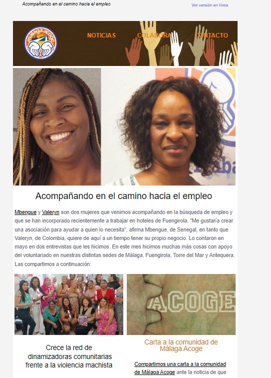 Encabezamos nuestro boletín de noticias mayo con dos entrevistas a mujeres que hemos apoyado desde nuestra área de Empleo y se han incorporado a trabajar en Fuengirola. También incluimos las historias de dos alumnas de clases de español en Málaga y nuestra carta a la Comunidad de Málaga Acoge tras la noticia de la subasta de la Junta de Andalucía del edificio que alberga nuestra sede de calle Ollerías y su adquisición por una empresa de apartamentos turísticos. Puedes leer el boletín AQUÍ.