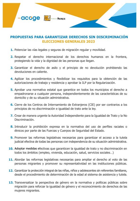 Andalucía Acoge y Red Acoge, organizaciones sociales que trabajan desde hace más de 30 años en la inclusión social de las personas migrantes y refugiadas, han presentado a los partidos políticos en las últimas semanas un conjunto de propuestas para garantizar el acceso a derechos de todas las personas sin discriminación.
