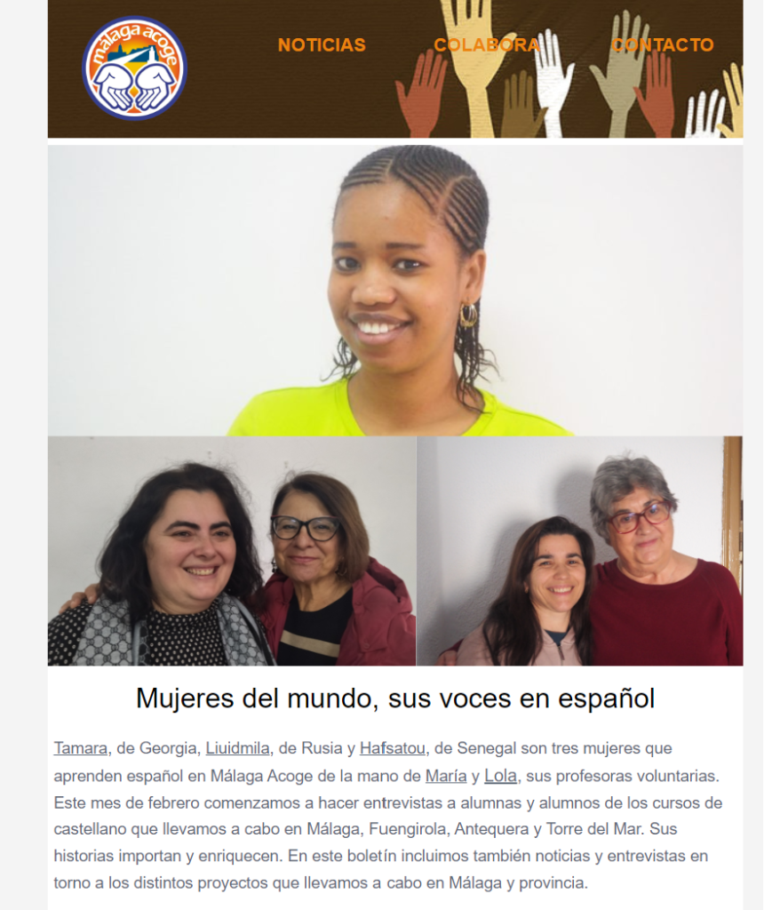 El boletín de noticias de febrero nos trae las voces de varias mujeres que están en nuestros cursos de español y nos cuentan sus historias, además de informaciones y entrevistas con personas que apoyamos y voluntariado de nuestros distintos proyectos en Antequera, Málaga, Fuengirola y Torre del Mar.