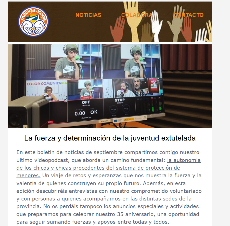 Septiembre ha sido un mes lleno de actividades, encuentros y novedades en Málaga Acoge. En nuestro boletín repasamos todo lo que hemos vivido: acciones, formaciones, entrevistas y mucho más. La noticia principal es el videodpodcast que grabamos en la emisora Color Comunitaria y en la que podemos ver y escuchar a Fouad, uno de los jóvenes que acompañamos en la asociación. ¡No te lo pierdas y descubre cómo seguimos trabajando por una sociedad más justa e inclusiva!