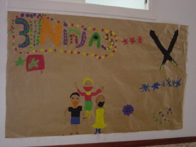 El tema de estas colonias es el cine. A partir de este tema hemos preparado diferentes actividades, como por ejemplo diseñar y dibujar carteles anunciando las películas que vamos a ver, que ellas eligieron, además de preparar entradas; es un juego, no vamos a vender entradas. Las películas elegidas fueron «Las tres Ninjas» y «Rompe Ralph». También estuvimos haciendo diversas manualidades móviles, que permiten ver escenas muy básicas en movimiento.