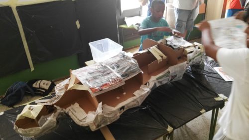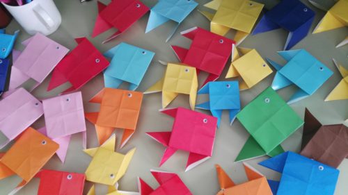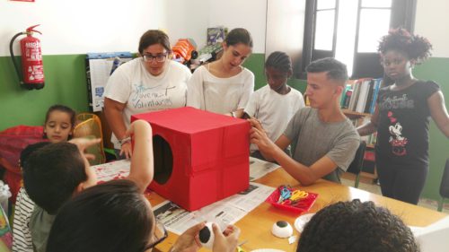 «Estamos haciendo dragones chinos. En China los hacen para el Carnaval», dice Lema, de 8 años, quien señala la cabeza de un dragón hecho de cartón. «Lo vamos a pintar, decorar y a ponerle cosas brillantes como cascabeles». Nuestra voluntaria Isabelle guía durante el trabajo: «¿Le hacemos una lengua?», les pregunta, mientras Pedro Herrera, técnico de Educación, crea peces de papel y pone puntos de cola para que los niños y niñas les peguen los ojos. A su lado, la voluntaria Jasmine, una joven suiza que está en un programa de intercambio en la Universidad de Málaga, cuenta lo gratificante que le resulta la experiencia del voluntariado a dos días de volver a su país.