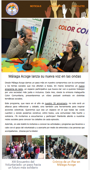 Como cada mes compartimos con todas nuestro boletín que encabezamos con la información sobre el lanzamiento del primer podcast de nuestro programa de radio en la emisora malagueña Color Comunitaria, y para el que contamos con la participación de nuestro director Alejandro Cortina, la vicepresidenta de la asociación Fátima Z. Aharez , Jesús García, presidente de Andalucía Acoge y Cristina Fuentes, de Fundación Por Causa. Además, incluimos un recorrido por noticias sobre actividades en las sedes de la entidad en Málaga y provincia y entrevistas con personas que apoyamos. Puedes leerlo AQUÍ.