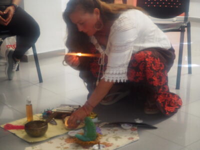 La sesión fue guiada por Silvia, dinamizadora, voluntaria del Área de Género y presidenta de la asociación de mujeres Casa Luna, quien supo crear un ambiente seguro y acogedor donde cada mujer pudo abrir su corazón. Silvia nos recordó la importancia de estos espacios: “Las mujeres necesitamos sostenernos unas a otras”. Además, subrayó que con estos encuentros “se trata de volver a nuestra raíz, a lo esencial y a nuestros derechos, ayudándonos a resetear y reconectar con nosotras mismas». Para ello, dispuso en el centro de la sala una vela, un cuenco con agua, otro con arena y una pluma, representando los cuatro elementos: fuego, aire, agua y tierra. Alrededor de ellos, las mujeres formaron un círculo, símbolo de unión y respeto.