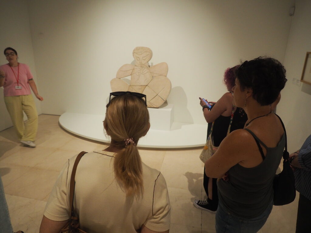 La jornada arrancó con un desayuno compartido en la Plaza del Obispo, creando ambiente de grupo y compartiendo impresiones con las dos trabajadoras sociales del CIS que les acompañaron. Más tarde, los y las internas pudieron recorrer algunas salas del museo con una guía, disfrutando con especial curiosidad de la sala de Cerámica y la escultura Flautista Cannes 1959, una piezas de arcilla blanca que sirvió de inspiración para el trabajo posterior. Para la mayoría, era la primera vez que visitaba el museo, y sus ganas de participar y descubrir no pasaron desapercibidas.